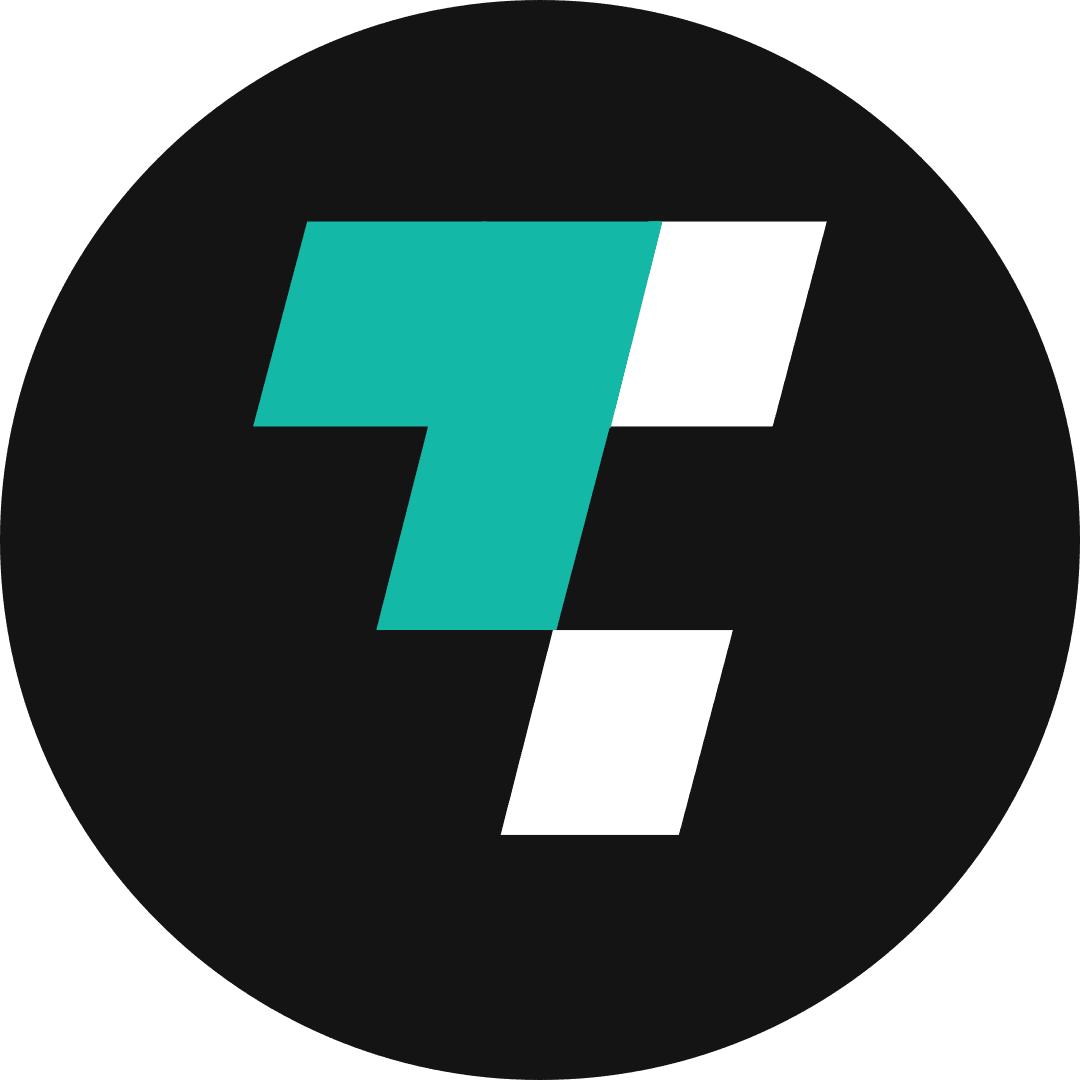 Circular icon mark, dark bg with teal + white